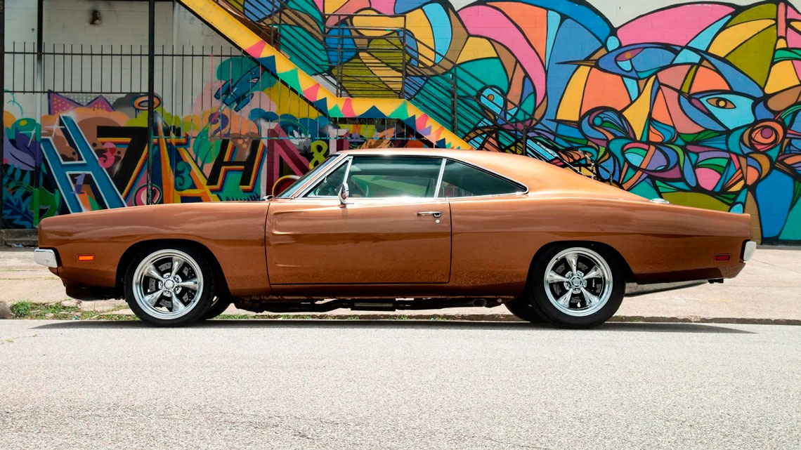 A restauradora e preparadora americana Bumbera Performance aplicou o que chama-se de “restomod” neste Charger, ou seja, uma restauração com modificações modernas em carros clássicos, transformando ele num verdadeiro Hellcat. Alguns sinais evidenciam isso, como o escapamento da Magnaflow e os discos de freio perfurados gigantes escondidos atrás das lindas rodas de cinco raios cromadas.