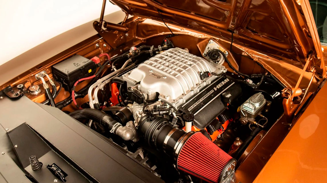 Por dentro, o carro perdeu o charme vintage, mas ganhou em conveniência. Tem um volante com uma pegada atual, melhor, uma central multimídia, ar-condicionado e partida por botão. E falando em partida, a melhor parte está sob o capô: um Hemi V8 6.2 de 716 cv e 89,8 kgfm de torque, trabalhando com um câmbio automático de oito marchas, que manda tudo para as rodas de trás.