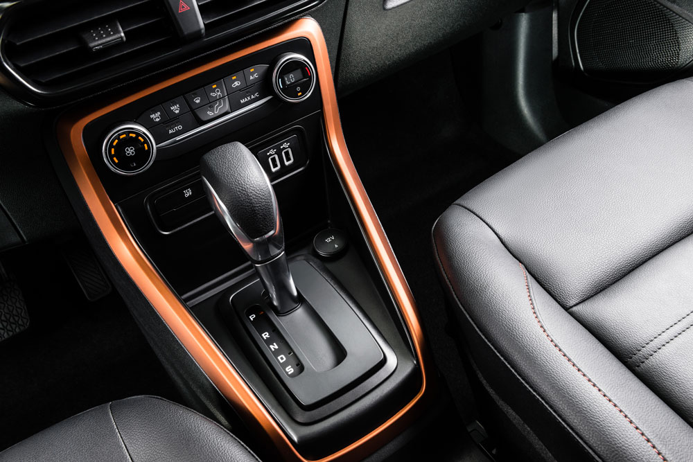 O motor 2.0 com injeção direta, flex, casa bem com o câmbio automático de seis marchas, com conversor de torque. As trocas podem ser feitas na alavanca ou nas borboletas atrás do volante de boa pegada, multifuncional. As rodas 17″ têm off-set diferente das outras versões do Ecosport e ficam um pouco mais pra fora, 5 mm de cada lado: para não saírem dos para-lamas, há um acabamento plástico nas caixas de rodas. Na traseira, o tradicional estepe se destaca e não há remédio: o carro foi desenvolvido assim e para tirá-lo dali, só desenhando uma nova plataforma, mudando assoalho…