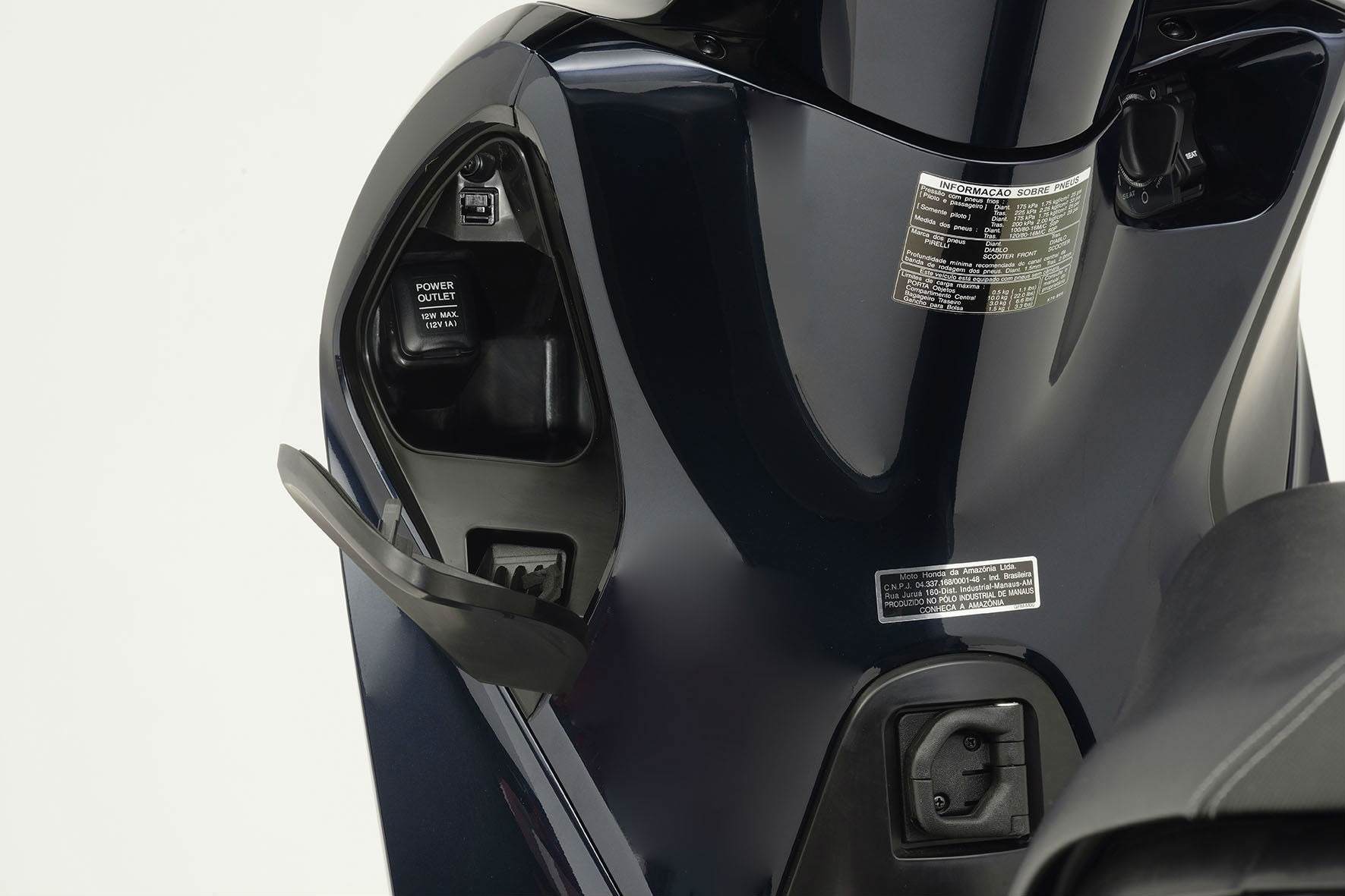Como é de lei nas scooters, a SH tem soluções pra facilitar o dia a dia com ela, como o compartimento onde está a tomada de 12V (que você vê na foto aí em cima), gancho na coluna para carregar sacolas (que, apesar de facilitar o transporte, poderia estar posicionado mais acima para evitar que elas raspem no assoalho da moto) e um bagageiro para um capacete pequeno sob o banco. Infelizmente, mesmo ela sendo maior, não espere o espaço generoso que a Lead tinha embaixo do banco.