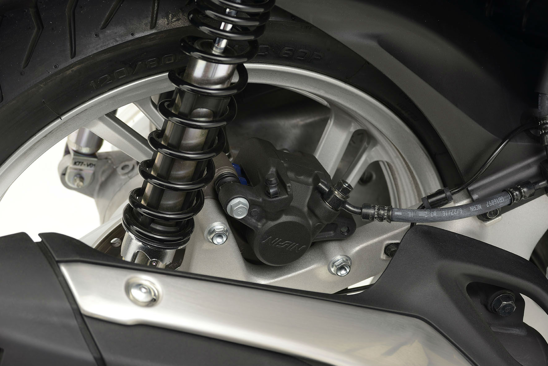 O par de rodas maiores e o entre-eixos um pouco maior que o da PCX (são 1.340 mm) permitem adernar mais a SH em curvas, o que é agradável pra pilotagem, mas tira um pouco de agilidade. A suspensão dianteira da SH é telescópica convencional, com curso regulável de 90 a 100 mm e a traseira conta com dois amortecedores, também ajustáveis, de 80 a 95 mm. Com o setup mais longo, a motinha fica confortável e certamente absorve melhor os impactos que as scooters menores, mas não vai achando que você pode varar lombada ou buraco, porque a coluna ainda sente bem o que os pneus tão fazendo.