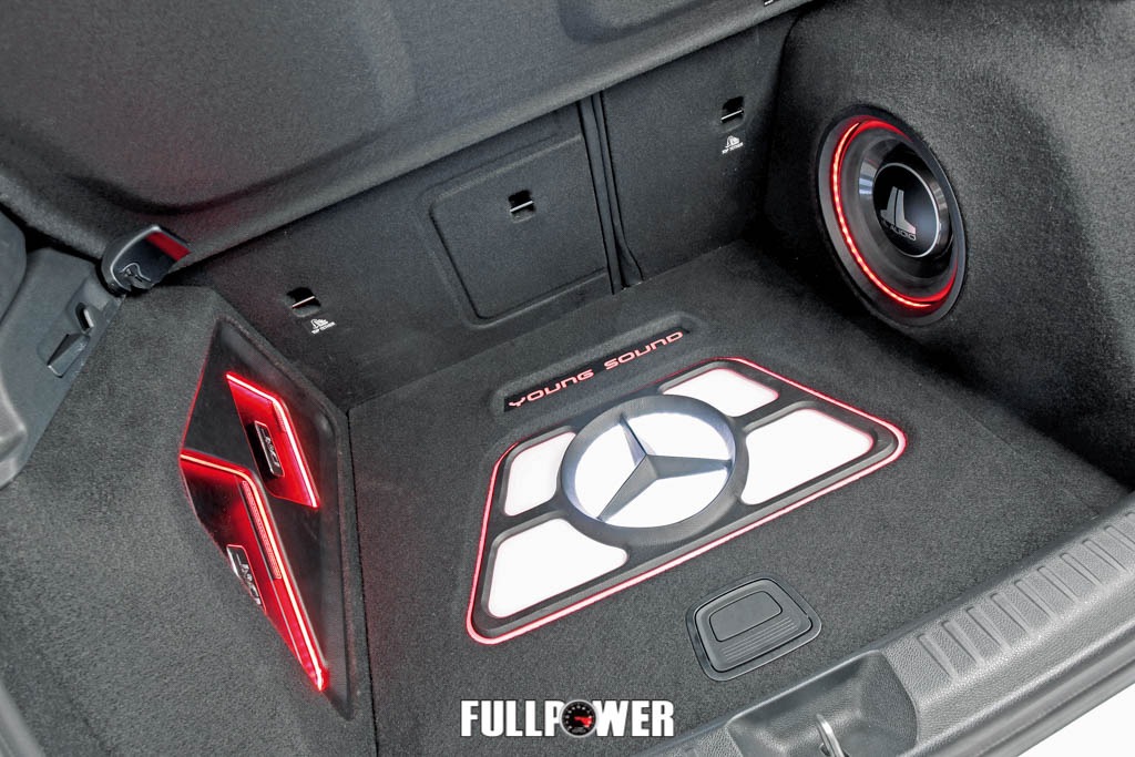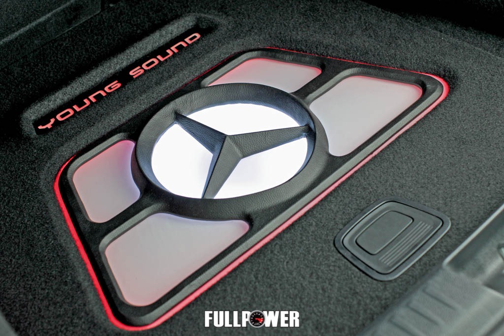 Para destacar ainda mais o trabalho, Carlão fez molduras acrílicas que envolvem sub e módulos e recriou o logo Mercedes (no assoalho) usando massa plástica. O toque final ficou por conta da iluminação, feita com lâmpadas LED que acendem nas cores vermelha e branca e garantem um visual mais moderno ao projeto.