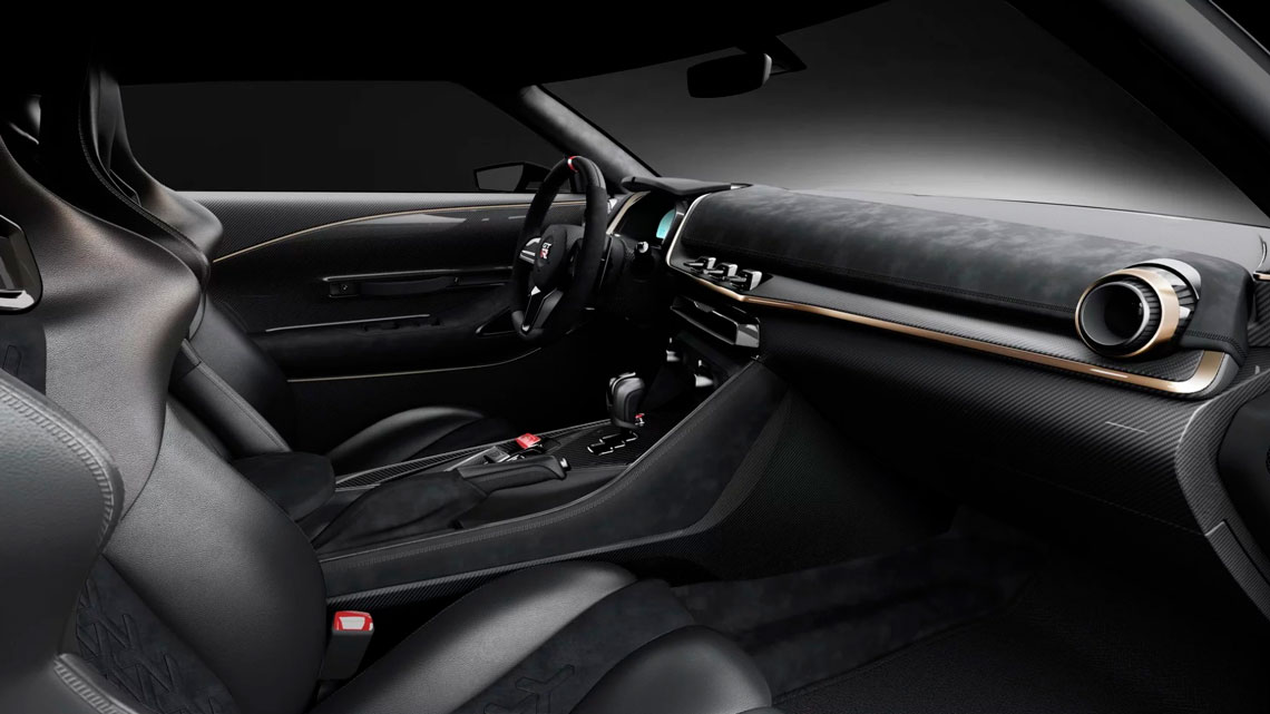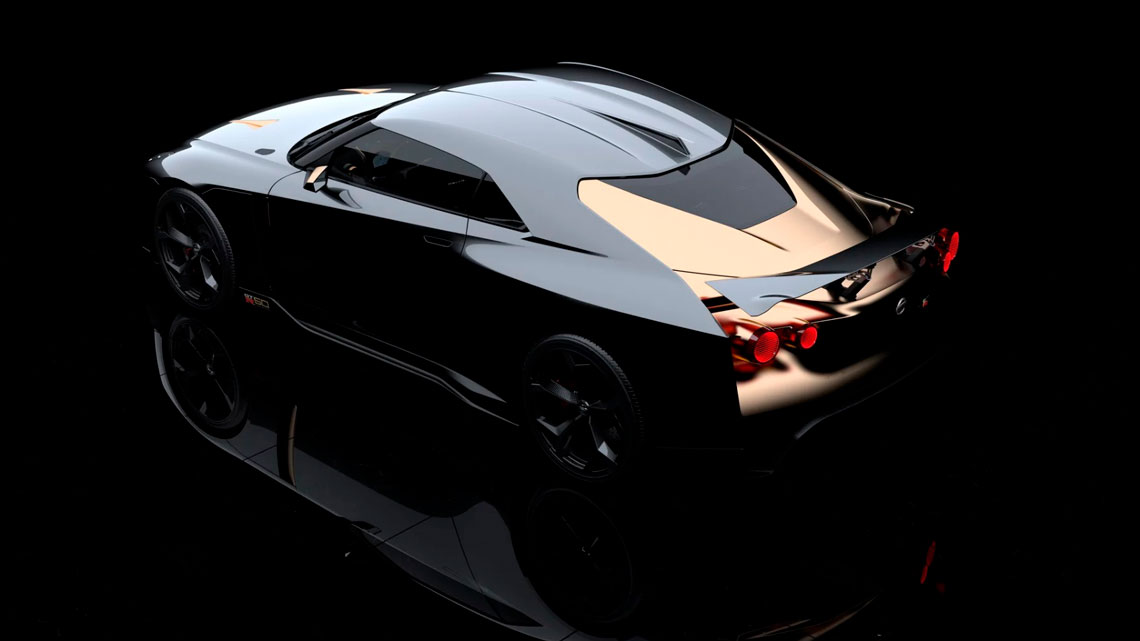 Pelas fotos dá pra perceber que o Italdesign mexeu bastante na silhueta do carro, dando uma alongada nos faróis e colocando vincos mais profundos no capô. O teto, 54 mm mais baixo, também tem curvaturas mais aparentes, que formam uma espécie de V a partir da coluna C até a traseira. Aparentemente, as lanternas terão um efeito “flutuante”, que devem destacá-las ainda mais, evidenciando uma das marcas registradas do GT-R. O cinza metálico da pintura contrasta com um tom dourado e as rodas têm 21”.