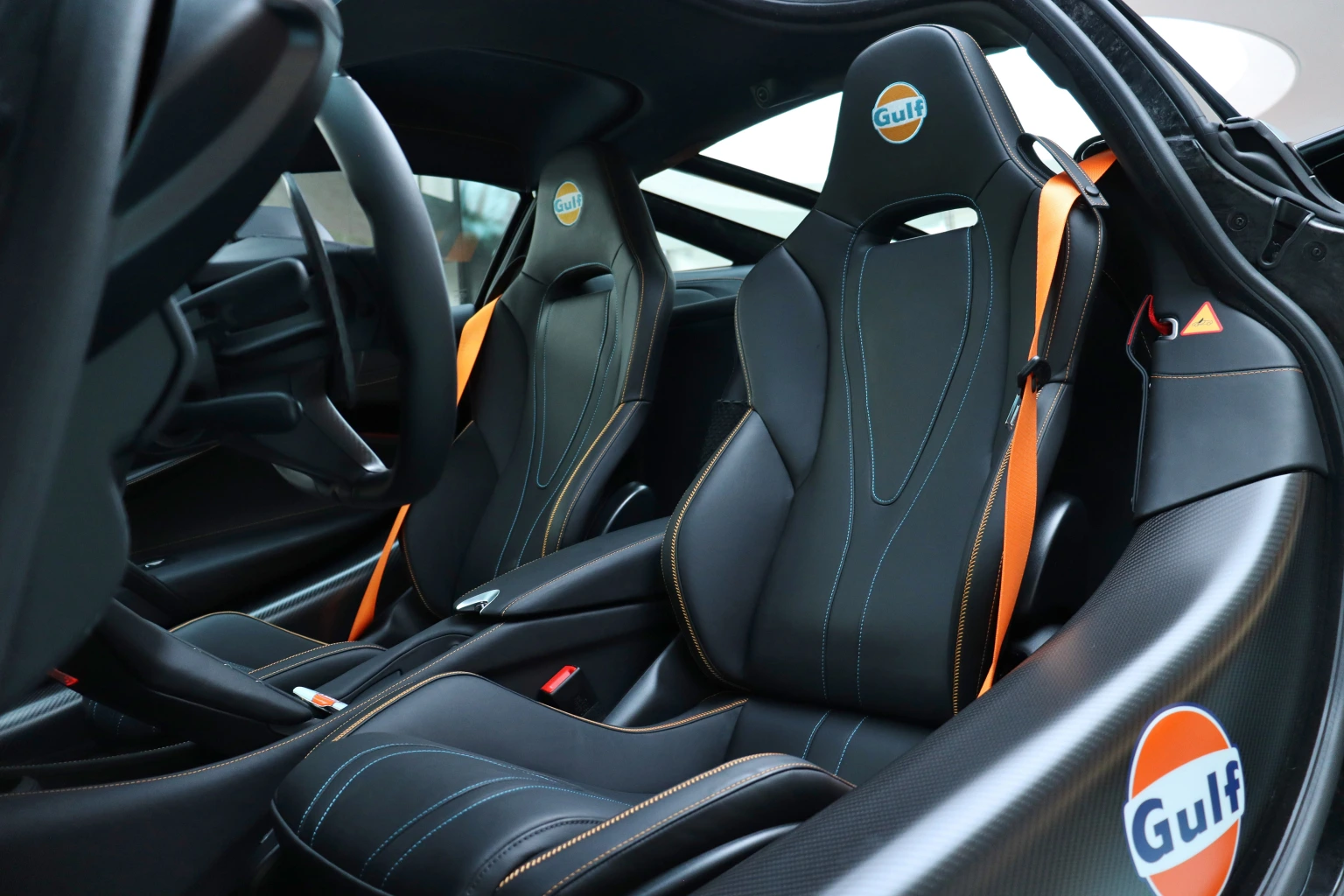 O interior também recebeu um cuidado especial com costuras azul e laranja pelo acabamento, logo da Gulf no encosto de cabeça dos bancos e nas laterais da estrutura em fibra de carbono. Os cintos de segurança receberam a cor laranja, e até a chave é personalizada. Vale lembrar que boa parte do interior é em fibra de carbono, incluindo volante, paddle shifters e o painel.