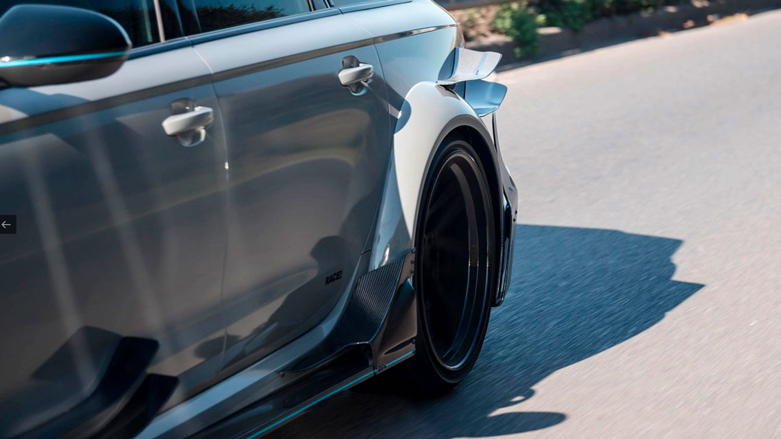 Pintado na belíssima cor Cinza Nardo, a perua recebeu um kit aerodinâmico de fibra de carbono da DarwinPro bem ao estilo da categoria de competição. Além do spoiler dianteiro (gigante), saias, difursor traseiro e um pequeno spoiler no teto, o que mais chama atenção nesse caso são as aletas monstruosas na frente e atrás do carro, combinando com os para-lamas super alargados do carro, com direito a saídas de ar para diminuir turbulência nas caixas de roda.