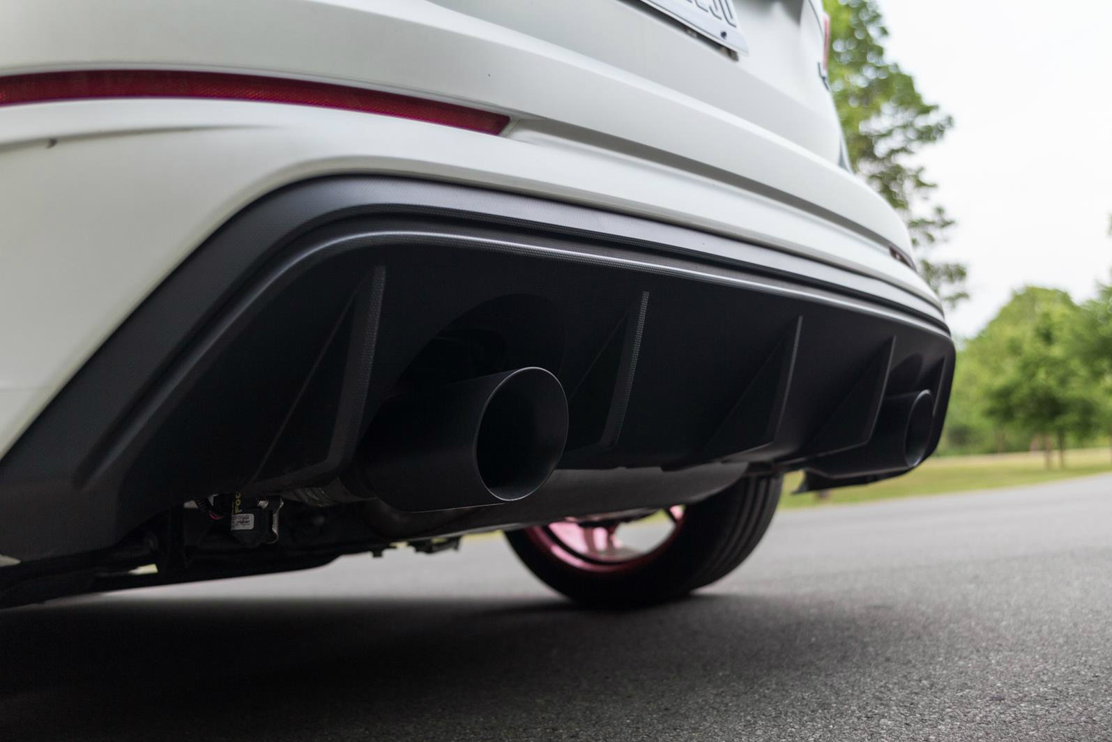 Visualmente, as rodas vermelhas de 19 polegadas da Vossen se destacam logo de cara, assim como o kit aerodinâmico mais robusto, especialmente o spoiler da frente (que deixam o radiador bem à mostra, com o logo da preparadora) e os difusores atrás. As entradas de ar do capô também são personalizadas.